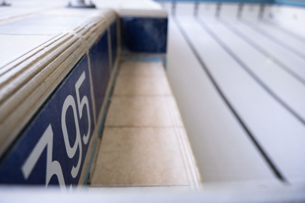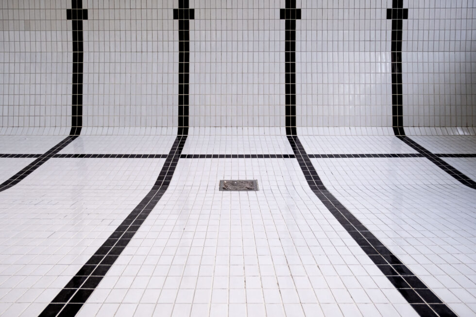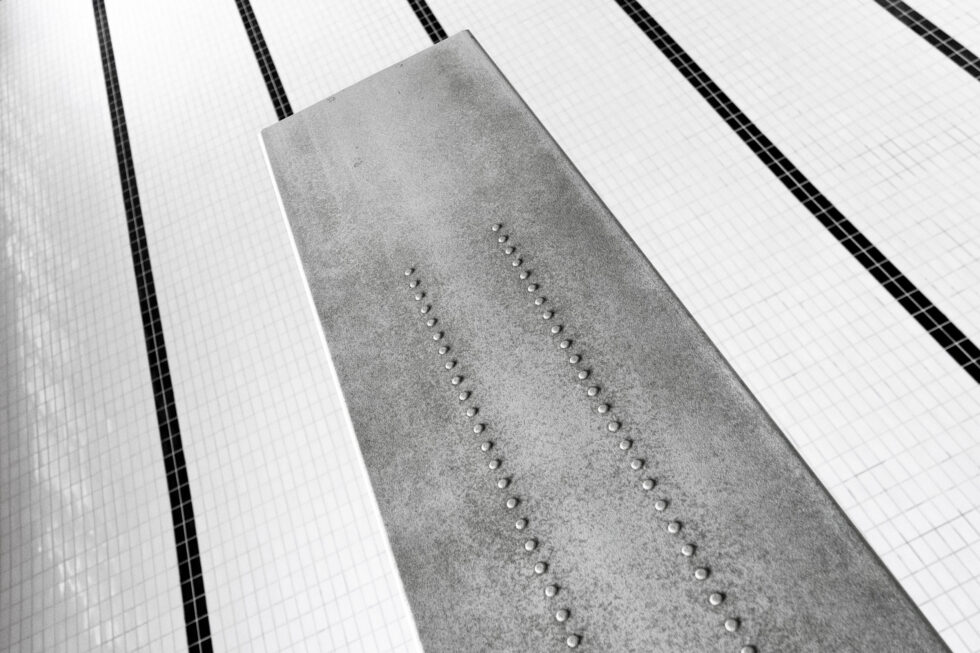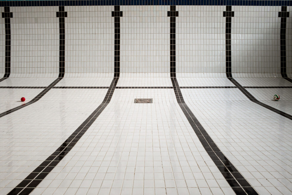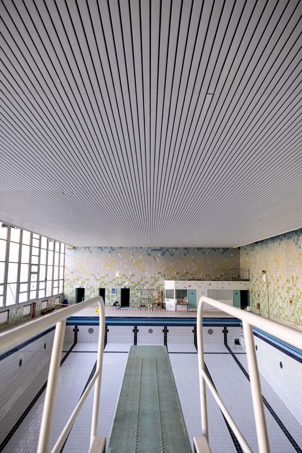 Sa hauteur sous plafond, ses plongeoirs impressionnants et ses grandes baies vitrées. Les lignes présentes partout, directrices : au fond du bassin en crawl, au plafond en dos crawlé.